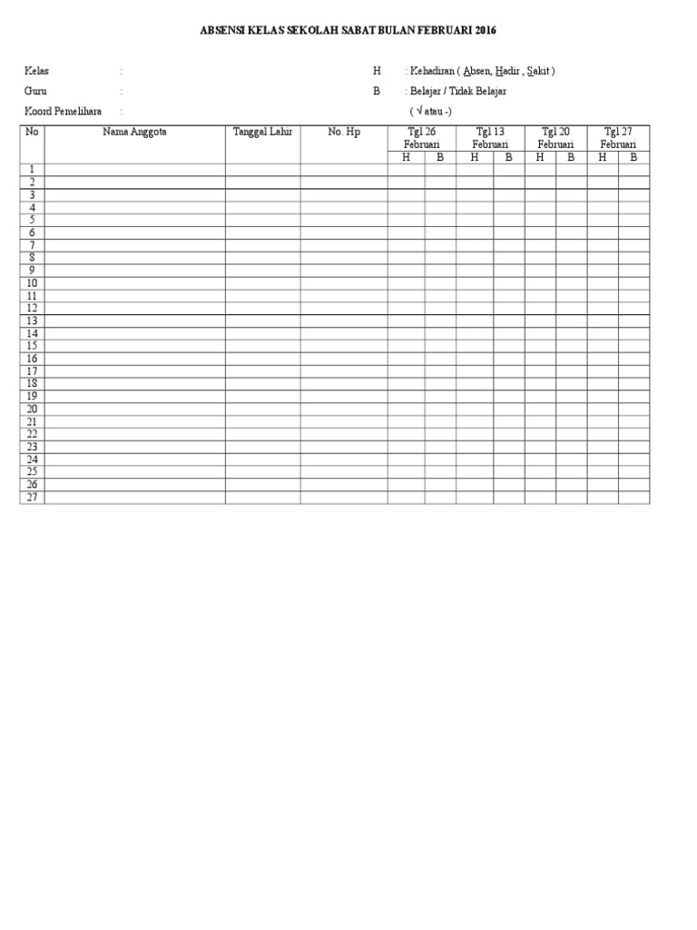 Absensi Kelas Sekolah Sabat Bulan Februari 2016 Pdf